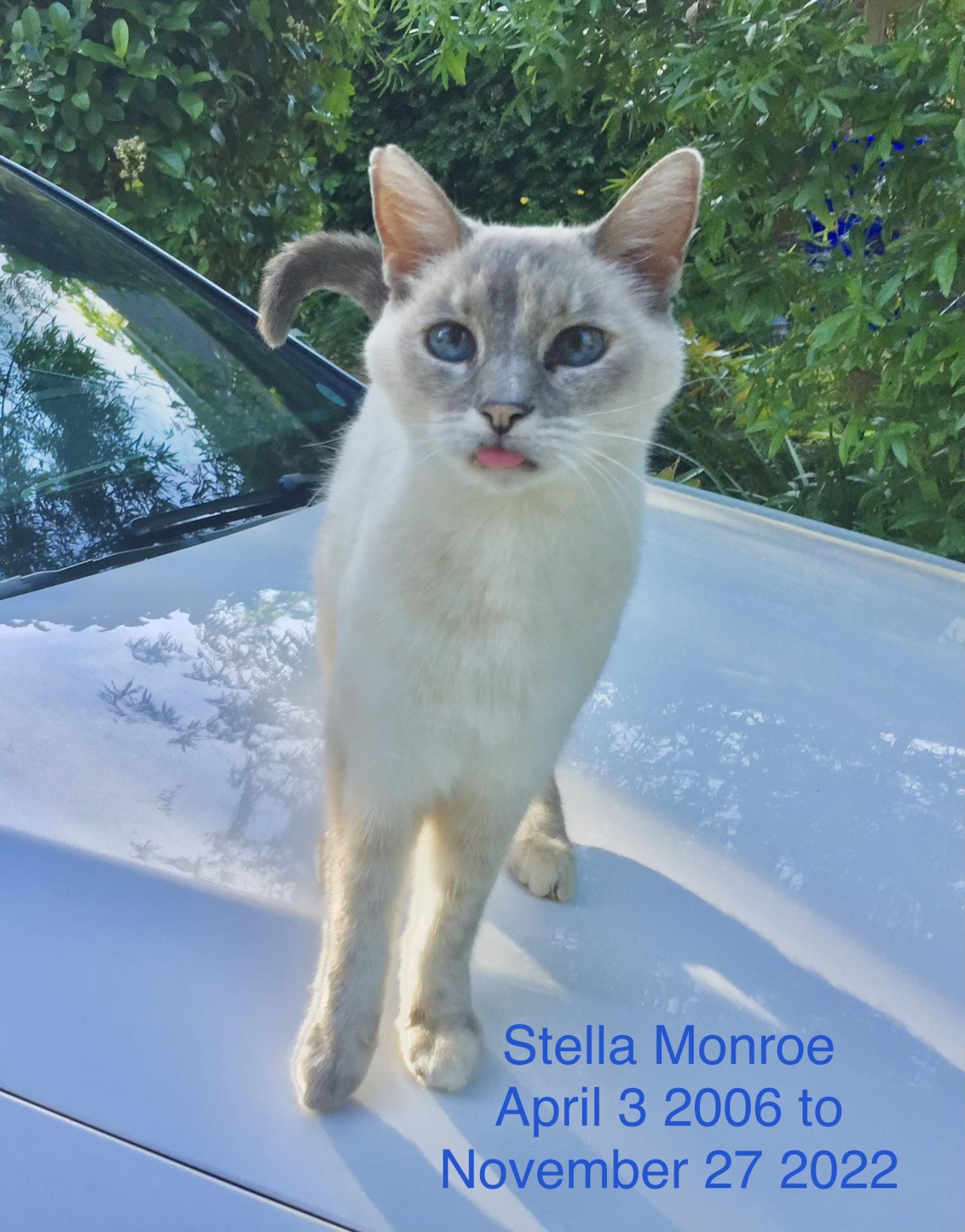 Our cat Stella was given to us as a house warming gift from my mother in 2006. At the time we didn’t want this little kitten but who could turn away such a precious little thing! As the years went on, she became such a companion, chasing me, me chasing her, like a game of ‘tag, you’re it’. Cuddles at night, always sleeping on me or near me. Then we moved from state to state and overseas due to my job. She has her own passport! Then we moved here to Mi. She traveled well and never complained. She used to go camping with us and loved her ‘licky-pops’. She was smart, funny, beautiful, and I miss her so much. Strange that such a small creature can leave such a hole in our hearts. The Novi Emergency Vet clinic was so nice and sympathetic to our loss. We received her remains in a nice urn but it’s still hard to believe she’s gone after almost 17 years. God bless our little baby, until we meet again.